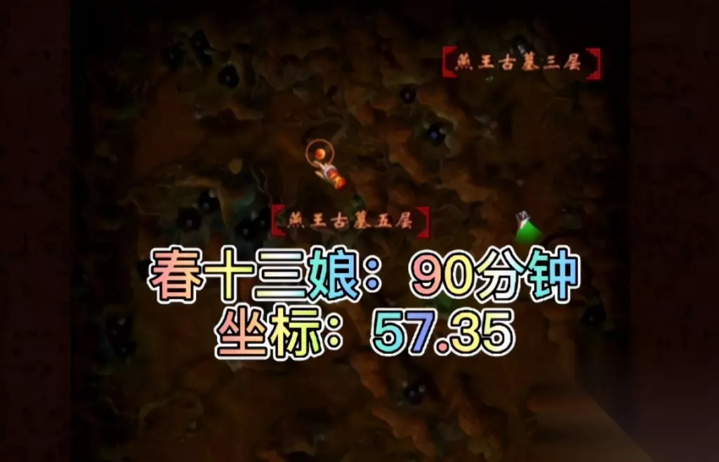 其实古墓BOSS的坐标倒不稀奇,但是刷新时间,却是有点门道的,每次刷新都是上一个BOSS被干掉后的一段时间。 一层鬼剑,坐标107.94,60分钟刷新一次。 二层岩魔,坐标101.35,90分钟刷新一次。 三层毒蜘蛛王,坐标103.65,360分钟刷新一次;缠丝蜘蛛王105.104,330分钟刷新一次。 四层春十三娘,坐标57.35,90分钟刷新一次。