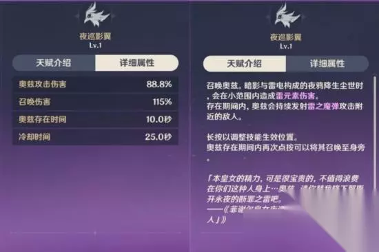 爆发效果:当奥兹存在于场上时会存在时间被刷新,获取的雷元素颗粒上限也会刷新。若奥兹不存在于场上则在结束后保留奥兹。(奥兹的效果和元素战技一样) 注:大招释放瞬间会快速移动,体积碰撞会缩小但不无视体积碰撞,化为奥兹形态时不属于无敌帧,依旧会被怪物伤害与击飞,可以通过切换角色结束奥兹形态,奥兹会保留在场上。 ————————我是分割线———————— 固有天赋·噬星魔鸦
