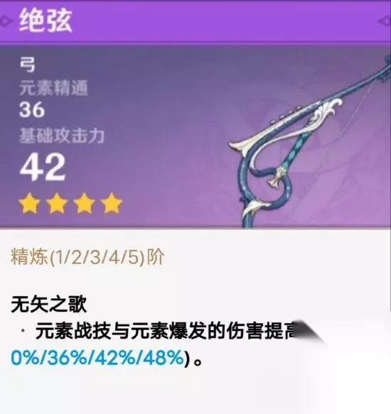终末弓的基础面板比起其他五星武器不高,但是比起四星武器还是不低的,元素充能方面可以使得菲谢尔在后台得到颗粒的大招稳定,使奥兹可以通过大招与战技互相延长时间,达到奥兹上时间在场,并且技能方面给菲谢尔提供元素精通,并且菲谢尔在后台时,也是可以给自己和队友提供元素精通加成,是众多辅助的不二之选。 注:千年大乐章系列武器同属性的加成时只会提供最高数值的加成提供,不会相互叠加,但不同属性的加成是可以兼容的。 目前系列已有武器:松籁响起之时,终末嗟叹之时。 次选:暗巷的闪光