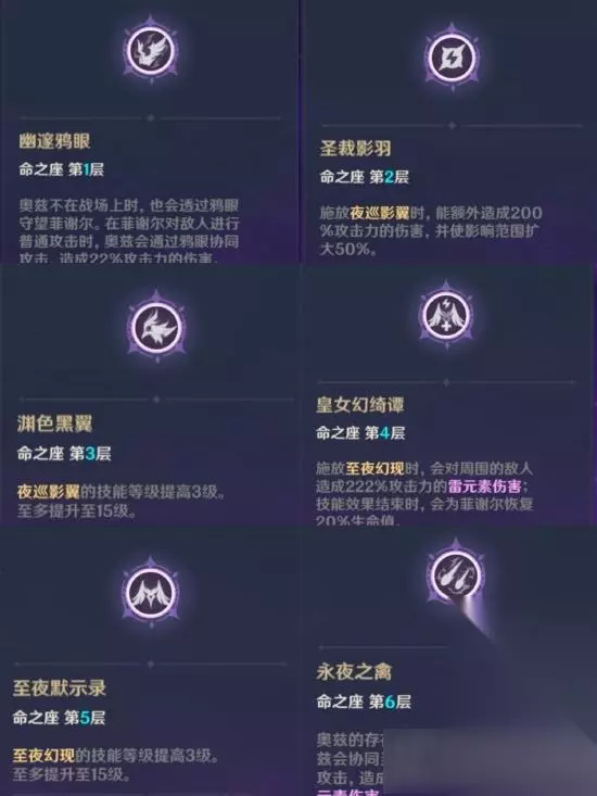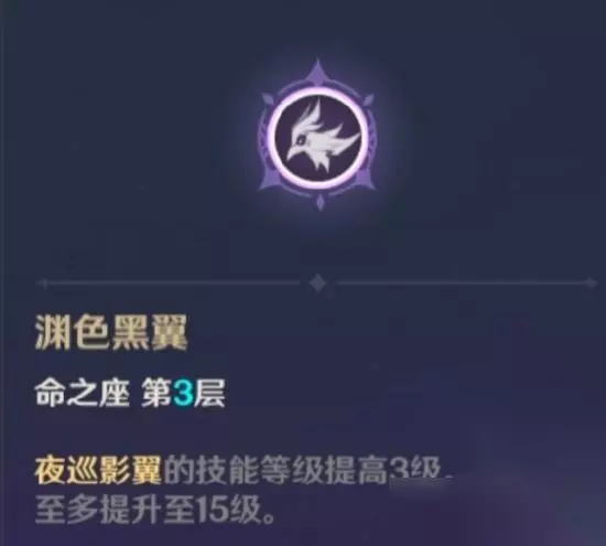 命座效果:增加元素战技释放时造成的伤害,与范围,但不会增加奥兹的攻击范围与伤害。 ————————我是分割线———————— 三命·渊色黑翼