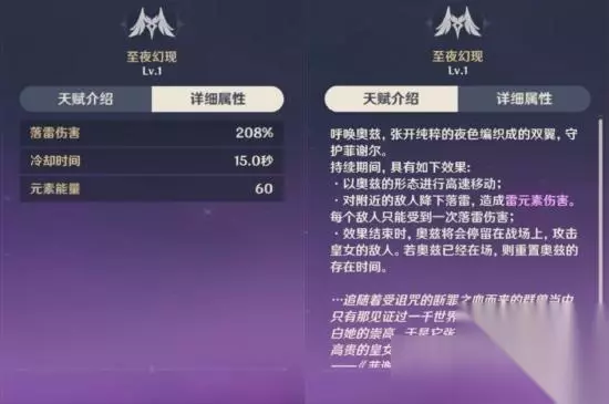 战技效果:召唤奥兹,长按可控制奥兹出现位置,奥兹出现时对一定范围内照成伤害,当奥兹在场时元素战技变为将奥兹召唤至身旁,但不造成召唤伤害,。 替换后技能:召唤奥兹到身边,不照成召唤伤害,但会刷新奥兹攻击的前摇读取,但由于奥兹攻击有 1秒的前摇时间,导致的后果则是奥兹的攻击次数降低。 奥兹:存在时间10秒不会因切换角色而消失,攻击速度为1秒/次共计10次伤害,若奥兹每次攻击命中目标时,有概率提供一个雷元素颗粒,最多提供7个雷元素颗粒(尝试结果,但也可能是我非)。 注:奥兹攻击有1秒的前摇,也就是攻击速度,从锁定目标开始读取前摇,若目标在读取期间离开奥兹攻击范围,前摇将重新读取,若范围内有其他目标,奥兹改变目标时不会重新读取前摇。 注:冷却时间在释放奥兹的那一刻开始计算 注:奥兹的攻击次数和持续时间受到设备影响。 高设置时:1秒/次,持续10秒,颗粒上限7个。 低设置时:1.2秒/次,持续11秒,颗粒上限6个。 ————————我是分割线———————— 元素爆发·至夜幻现: