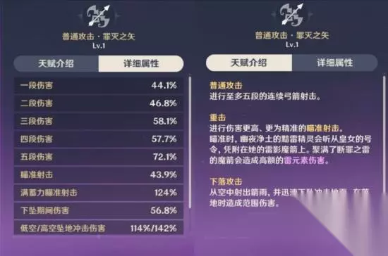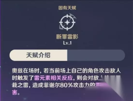 这个天赋可以视为提升蓄力完成的瞄准射击伤害的倍率,并改完范围型伤害。有些萌新可能会问了,这个天赋有用吗?我们分为两个利弊部分来讲: 利:此伤害为范围性伤害,倍率高达:189.348%(一级)340.521%(十级)对比其他角色,除了甘雨二段蓄力能超过她,其他角色基本都不如她。如果单从倍率来看来四星角色中算是十分强势,但也只是倍率。 弊:这个效果必须有奥兹在场,且满蓄力击中奥兹才可以触发,中间如果击中其他目标或者未击中奥兹,则无法触发。而奥兹不具备嘲讽效果,怪物的目标会在菲谢尔身上,并且此效果范围不大,当我们蓄力完成前,容易被怪物打断,若拉开距离怪物又会离开有效范围,且箭可能被怪物阻挡,在蓄力期间无法召唤奥兹。 总结:结合利弊得出结论为,此天赋弊端远远大于利率,不适合用于实战打法。 ————————我是分割线———————— 固有天赋·断罪雷影