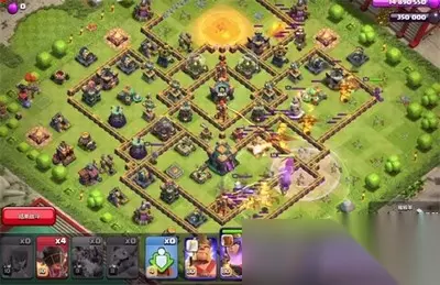 部落冲突十周年挑战赛2021通关攻略 1、从12点钟位置放置车子砸掉这里的天鹰火炮,龙从3点到6点位置一字划。 2、防空火箭用两个气球兵来清掉,给火龙浅浅清个小边。 3、后续放置兵种来进行平推,之后女王出来,打下这个电塔。