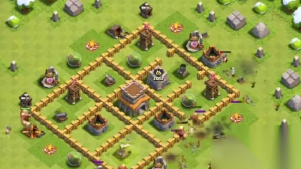 4、这里断个边,然后龙就开始一字划向前走,火箭气球兵留着收尾。 5、平推的过程钟看到核心的防御建筑给一个狂暴或者冰冻,速度更快。 6、再把最后的火箭气球兵放上就可以稳定的通关,满星过关。