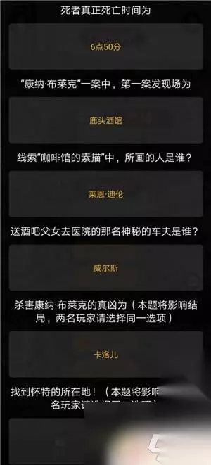 1.闹鬼事件: 元凶为莱恩:迪伦--为了得到亚历山大的房子,从而拿到威尔斯藏起来的宝藏。莱恩前几天便将学校教室中的电石抛向亚历山大的窗户,而前几日都是晴天则相安无事。直到29日起了朝霞,莱恩趁夜晚将家中的骷髅骨架( 作家剧本)与窗帘( 全文唯一的白色。作家剧本提到从不拉开窗帘,而线索表示当天邻居却透过窗户看见了莱恩,那窗帘去哪里呢? )伪装成新娘的样子,摆在了亚历山大家后院。而亚历山大下班时正好遇到了正在抛尸的卡洛儿,吓得跑回家。熟睡之际天下起了雨(警察剧本中自己和亚历山大都有提到),电石遇水引起了爆炸(自然发生),醒来的亚历山大往窗外看正好看见了莱恩布置好的“女鬼” 2珠宝抢劫案: 元凶为: ----凯恩迪伦:通过莱恩家中的壁画得知他有一个双胞胎兄弟凯恩( 莱恩家的壁画),且其中一人是戴银耳环的。而莱恩的介绍( 线索莱恩迪伦)说他从不戴饰品,得知戴银耳环的人为凯恩迪伦。配合警方给出的特征“银耳环”得知为抢劫犯之一。 --戈登怀特:作家剧本里,怀特回忆到他的父亲有一颗大金牙,配合警方给出的特征“大金牙”得知为抢劫犯之一。 --威尔斯: 1.通过怀特家中的子弹调查,配合黑市购枪指南,得到这颗子弹用于猎枪。而怀特的回忆中提到鹿头酒馆的装饰多为捕猎工具,得知威尔斯从前是-名猎人,遂猎枪属于威尔斯。2.莱恩家中未寄出的勒索信表示,如果对方不给钱,就会对他的宝贝动手,而在场有子女的只有威尔斯和戈登,而作家剧本得知戈登跟儿子亨利的关系并不好,所以宝贝应为卡洛儿。3.通过莱恩闹鬼恐吓亚历山大的动机,亚历山大的房子从前是威尔斯的,为了拿到威尔斯私藏的财物,莱恩才会去恐吓亚历山大让他搬走。 2.5珠宝抢劫案的过程: 戈登怀特,凯恩迪伦,威尔斯三人组成团伙,闯入珠宝店抢劫,而威尔斯杀害了前来阻止的巡警爱德华布莱克。被警方包围后,威尔斯穿上了巡警的衣服,头戴麻袋,假装成爱德华.布莱克巡警被挟持,而将巡警的尸体蜷缩起来,塞进皮箱,所以当天根本没有抢到什么钱。 (假如不塞进皮箱,则警方发现人质已死后会立刻全速追击。假若让警方认为劫匪还持有人质,则会保持距离。)。之后戈登与凯恩挟持着伪装的威尔斯,光明正大的乘上马车立刻现场。途中穿着巡警制服的威尔斯还下车告诉了后来的巡警已经跟丢了目标。第二天他们将布莱克的尸体丢弃到港口,威尔斯却看见了吊坠上的一家三口,内疚不已,随将吊坠塞进口袋而被凯恩看见,以为他私藏宝物,从而引起了闹鬼案件的发生。 3.杀害布莱克的真凶为卡洛儿。 第一步:排除7点后出现的所有布莱克。咖啡馆的布莱克通过对比( 咖啡馆的素描与作家剧本中布莱克的描写)细节得知他不是真正的布莱克。而当天能够假扮成布莱克只有威尔斯,沃克,莱恩.迪伦有可能(卡洛儿工作量大走不开,怀特在上课,戈登在港口),而根据情书2描述,需要避开学生看见的只有与学校有关的莱恩迪伦。莱恩让双胞胎兄弟凯恩假扮自己.上课(.上课讲的慢和十分详细的演讲稿),自己去咖啡馆下迷药( 咖啡馆的咖啡),想绑架卡洛儿(未寄出的要挟信)。而港口的布莱克是从酒馆出来的,他是否为真正的布莱克暂定。( 早起的市民) 。 第二步:推测真正的死亡时间。双方剧本中多次提到冰冻能推迟死亡时间判断约1小时,加上假设7点钟之后对布莱克的两次目击都是假的情况下。大胆推测死者被冰冻过,真正死亡时间为6点50,通过酒馆邻居的证词得知死者正在鹿头酒馆,从而就能排除掉其他所有人的嫌疑。仔细阅读警察剧本会发现,当天酒馆的酒水都没有冰,因为冰桶中装着尸体。 第三步:还原尸体运输过程。首先得知死者在6点50分已经死亡,而卡洛儿因为工作量不可能离开酒馆,所以只有卡洛儿的父亲威尔斯能穿着死者衣服和贝雷帽离开了酒馆,并去了港口丢弃凶器和衣服。之后在晚上,通过伪装成马车车夫(马车租借凭证),以及邻居证词中根本没有看清他们的脸(酒馆邻居的证词),可以得出当时马车司机为威尔斯,而被搀扶着的是尸体。通过地图( 迷失港地图)得知从酒馆出发必须经过宰鱼场,而当天同一时刻亚历山大目击到了卡洛儿抛尸,并锯下死者左手的过程( 带倒刺的宰鱼刀和卡洛儿手上的伤口),得知宰鱼场是抛尸现场,而通过河流运输到了下游的港口,被废弃巨轮卡住。而威尔斯到达医院前,用铁雕塑( 钢铁鲷鱼)敲击自己的小腿,做出腿伤的样子,掩饰搀扶尸体的事实。 第四步:判断真凶。符合如上整个案发过程的,仅有鹿头酒馆的父女,互为帮凶。而真凶不可能为威尔斯,1.主要判断,是通过威尔斯是资深的猎人,且有可能是15年前杀害巡警的真凶,他清楚的了解怎么样能够一刀致命, 而不需要多次刺击才能杀害死者。只有卡洛儿符合凶手当时的状态,且父女两人仅有卡洛儿有情书1作为动机。2. (其次)警察剧本第三幕听见威尔斯与戈登的对话,配合解开“日记中提到的财物”的过程中,能得到-组密码为sorry,且最后宝藏为爱德华布莱克的吊坠相片,可以得知威尔斯对于康纳布莱克不仅没有杀意,甚至还深怀愧疚。威尔斯做的事情只为了保护女儿卡洛疚。威尔斯做的事情只为了保护女儿卡洛儿。 4.完整故事流程: ( 括号中为线索) 1870年,马车车夫亚历山大不小心撞死了( 1870年的旧报纸)威尔斯的妻子(酒馆的照片),导致卡洛儿与威尔斯两人相依为命。而亚历山大转行去