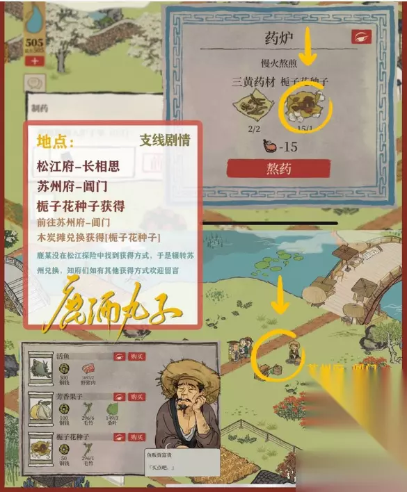 图10-制造 点击[药炉]进行制造 制造所需[栀子花种子]获得:前往苏州府探险-阊门地图,[木炭摊]兑换获得[我没有在松江探险中找到获得方式,于是辗转苏州兑换,知府们如有其他获得方式欢迎留言]