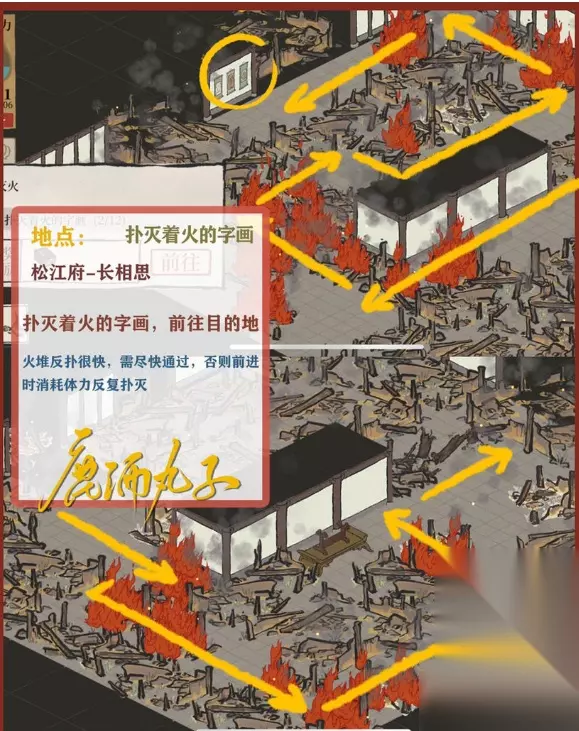 图7-扑灭着火的字画 扑灭地上的火堆,前往目的地 注:火堆反扑很快,需尽快通过,否则前进时消耗体力反复扑灭
