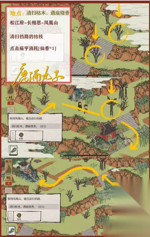 图4-清扫枯木,遇庙烧香 清扫挡路的枯枝即可前行,点击目标庙宇,消耗[仙香*1]完成烧香 注:枯枝无需全部清除,可以通行即可