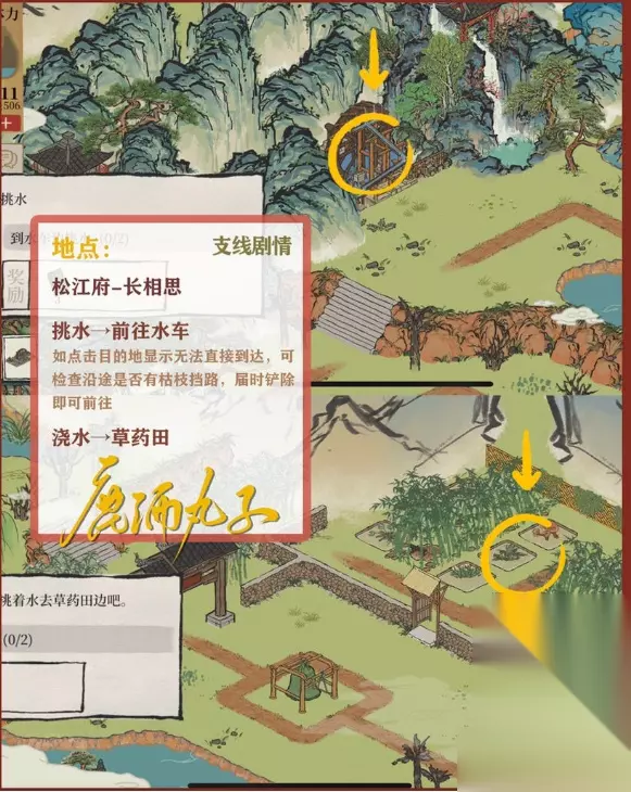 图9-挑水浇水 点击目的地显示无法直接到达时,可检查沿途是否有枯枝挡路,届时铲除即可通行前往