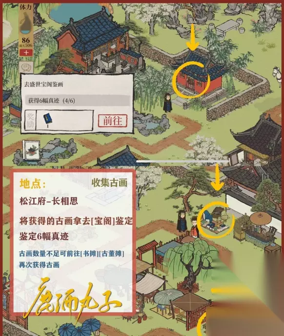 图6-鉴定古画 将获得的古画拿去[宝阁]鉴定 需鉴定出6幅真迹 注:古画数量不足时,可继续前往商摊处再次购买