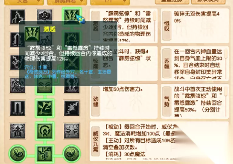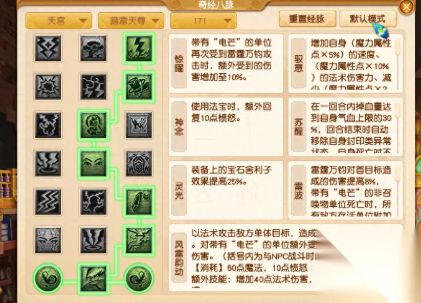 所以这个流派的玩法就是,转到这个流派以后获得返璞被动,然后该用天雷斩还用天雷斩,就抓鬼的时候脱鞋挂个风雷斩。其余技能就当没有。 经脉的点法,第一丹点激越,两个强化效果持续时间内造成伤害物理伤害提高12%。