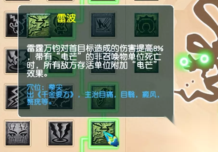 六丹肯定点雷波,带电芒的单位死后能给剩余敌方单位增加电芒。 如果没有这个丹,魔天宫的电芒基本发挥不了作用。凡是第一回合出手,挂上电芒的单位,基本很难活到下次出手。只能通过这种方式全体上电芒。