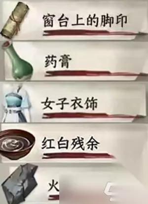 证据出示顺序: 窗台上的脚印-药膏-女子衣饰-红白残余-火石