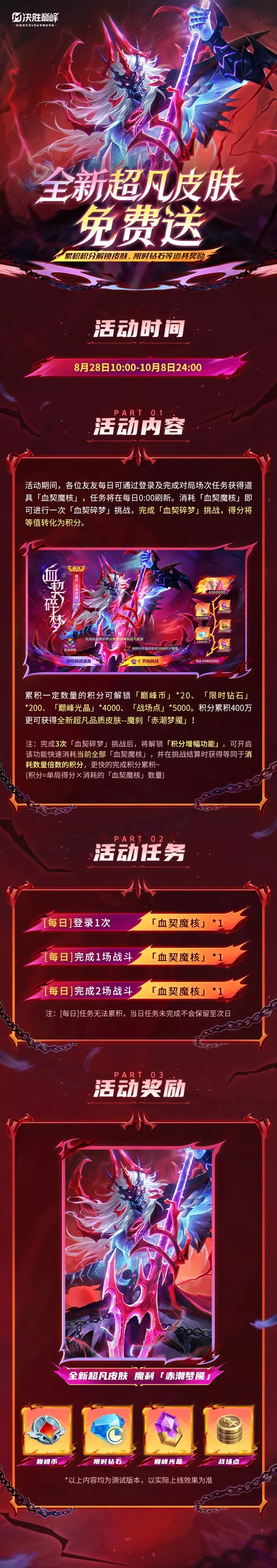 8月28日-10月8日,各位友友参与活动即可免费获取魔刹全新超凡皮肤「赤潮梦魇」,还有「巅峰币」、「限时钻石」、「巅峰光晶」、「战场点」等道具奖励等你领取~