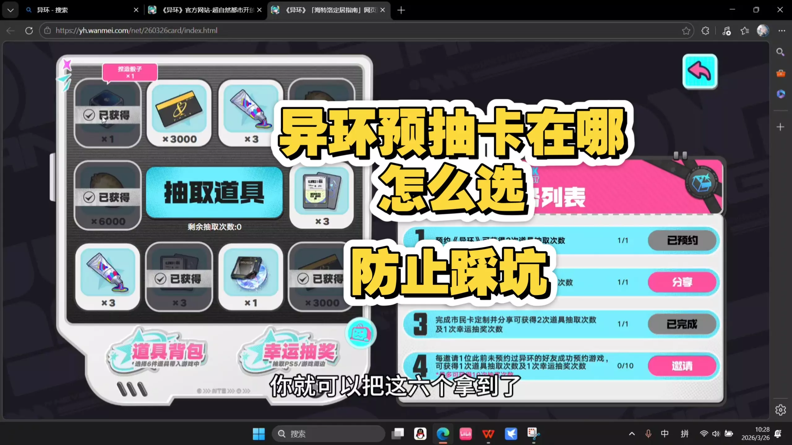 这是手游《异环》公测前的攻略内容,包含预抽卡白嫖指南,介绍了海特洛定居指南活动的参与方式、道具选择建议,还有避坑提示,帮助玩家在公测前获取更多福利。