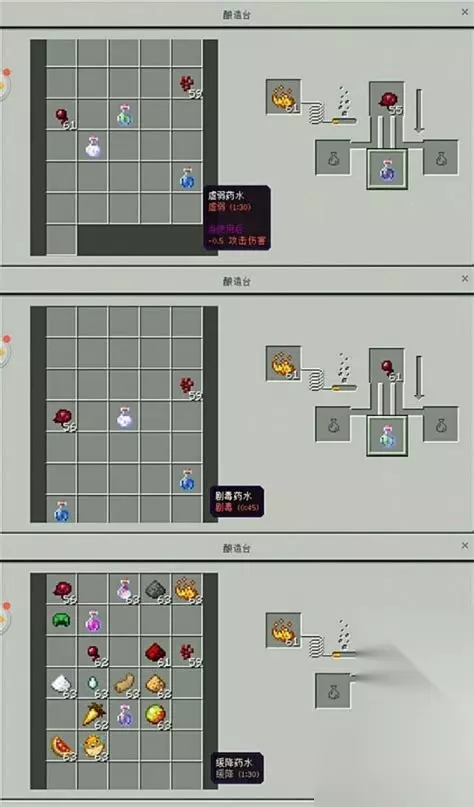 《我的世界》隐身药水做法: 隐身药水的制作流程 1.粗制药水和金萝卜放在酿造台里酿造成夜视药水; 2.将夜视药水和发酵蛛眼放在酿造台里酿造成隐身药水。 如果在怪物很多的地牢或者矿洞里,可能3秒中的隐身时间也无法满足大家了,没事,我的世界手机版里还有隐身药水的延长版!那么,隐身药水要怎么延长时效呢? 延长隐身药水时效的方法: 1.隐身药水和红石粉一起放到酿造台里酿造; 2.夜视药水和红石粉一起放到酿造台里酿造成延长夜视药水,然后再将延长夜视药水和发酵蛛眼一起放到酿造台里酿造成延长隐身药水。 最后,小编跟大家分享一下我的世界手机版药水配方一览。按照这张图,大家就能很快的找到制作相应药水的方法以及酿造所需的材料。 掌握了我的世界隐形药水怎么做之后我们就可以放心的去怪物众多的地牢了。欸!你看不到我! 合成隐身药水方法: 1、首先玩家需要准备地狱疣、装水的玻璃瓶和金萝卜先合成夜视药水。金萝卜需要在工作台上面放上萝卜,之后在周围围上一圈金粒就可以合成金萝卜。之后将玻璃瓶装上普通的河水,然后使用地狱疣和水瓶做一个粗糙药水,再使用金胡萝卜和粗糙药水合成夜视药水。 2、夜视药水合成以后,再准备发酵的蜘蛛眼,使用工作台放上糖、蜘蛛眼、灰色蘑菇(随意摆放)就可以获得发酵蜘蛛眼。 3、最后在酿造台上面使用发酵蜘蛛眼和夜视药水就可以合成隐身药水,不过这种隐身药水喝了之后只能保持3分钟的效果。 地狱疣获得方法: 1、先使用黑曜石做一个地狱传送门,之后用打火石开启传送门,送自己达到下界。 2、达到下界之后,在下界中可以找到地狱疣子,你收集一些再回来就可以了。 玻璃瓶获得方法: 玻璃瓶可以打女巫获得,也可以使用玻璃来合成,之后去河里面灌上水就可以了(普通的河水)。 蜘蛛眼获得方法: 蜘蛛眼可以在洞穴里面蜘蛛身上掉落,这个蜘蛛一般都在洞穴里面,比较常见,不算难获得的。 相关攻略:《我的世界》命名牌用法
