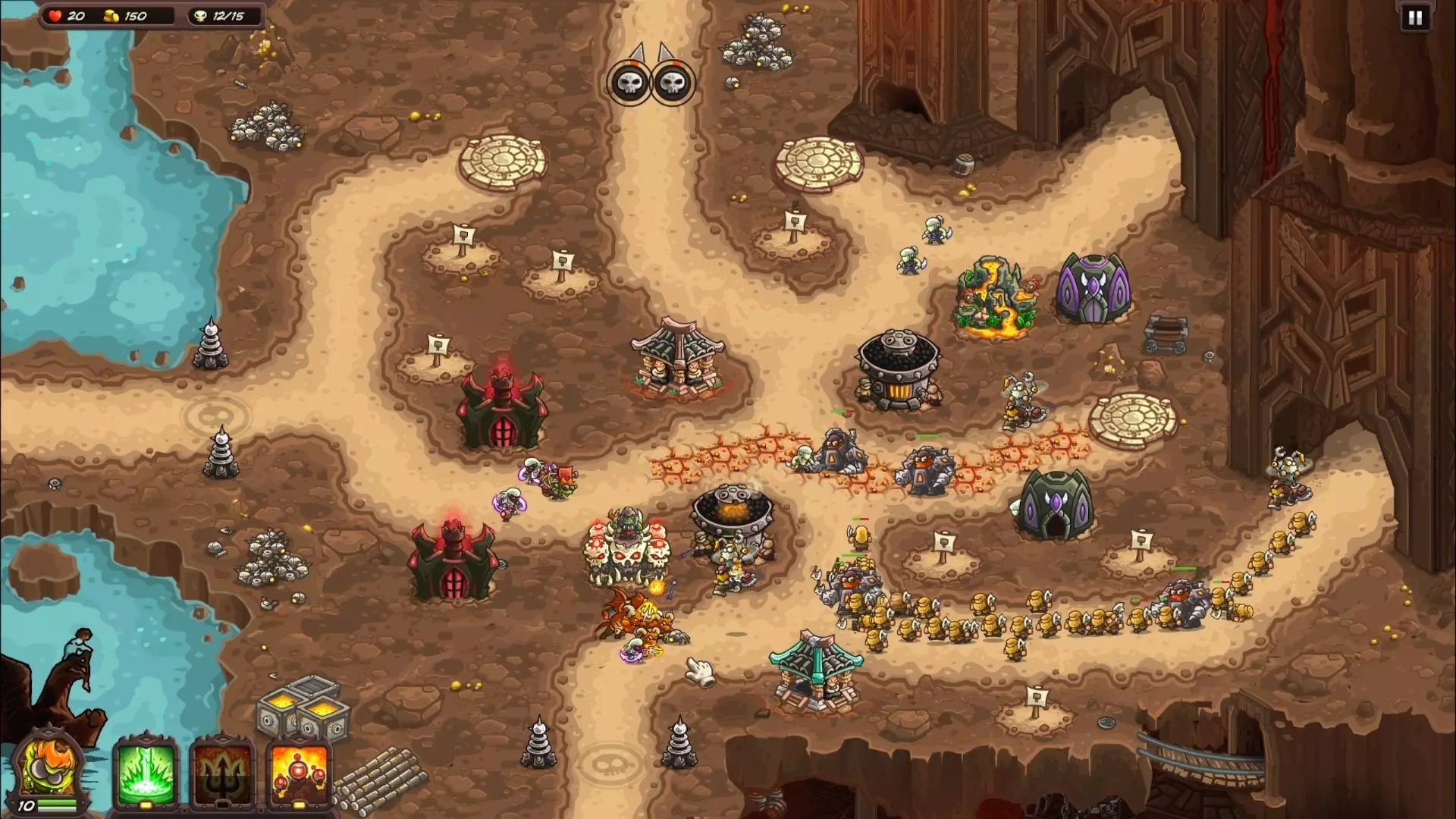 本关难度:极低 重开次数:0 要点:没多大改动的关,建议造鱼人塔,又能打骷髅又能打幽魂,腐朽的塔位就造飞艇和兵营,非常简单的一关