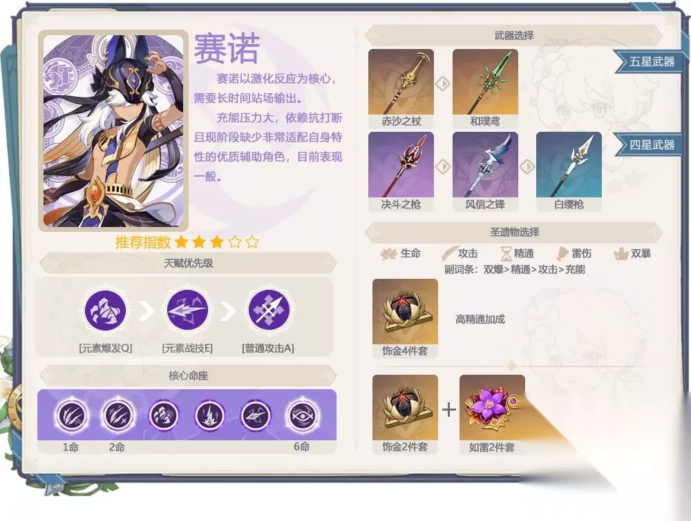 武器分析 武器推荐:赤沙之杖>和璞鸢>决斗之枪>白缨枪 [赤沙之杖]: 赛诺专武,赛诺输出最高的武器。542白值+44.1暴击; 武器特效可将精通转化为攻击力。 [和璞鸢]: 常驻五星武器,赛诺输出第2的武器。674白 值+22.1暴击;武器特效的攻击力加成需要攻击叠层,与赛诺高频攻击的输出模式十分匹配。 [决斗之枪]: 大月卡武器,赛诺伤害最高的4星武器。454白值+36.8暴击; 武器特效的加攻加防常驻触发。 [白缨枪]: 仅能通过开宝箱获取的3星武器,赛诺性价比最高的平民武器。401白值 +23.1暴击;武器特效加普攻伤害,与赛诺高频普攻攻击的输出模式十分匹配。 其他武器推荐:风信之锋>贯月矢>匣里灭辰>喜多院十文字 1、期望值对比: