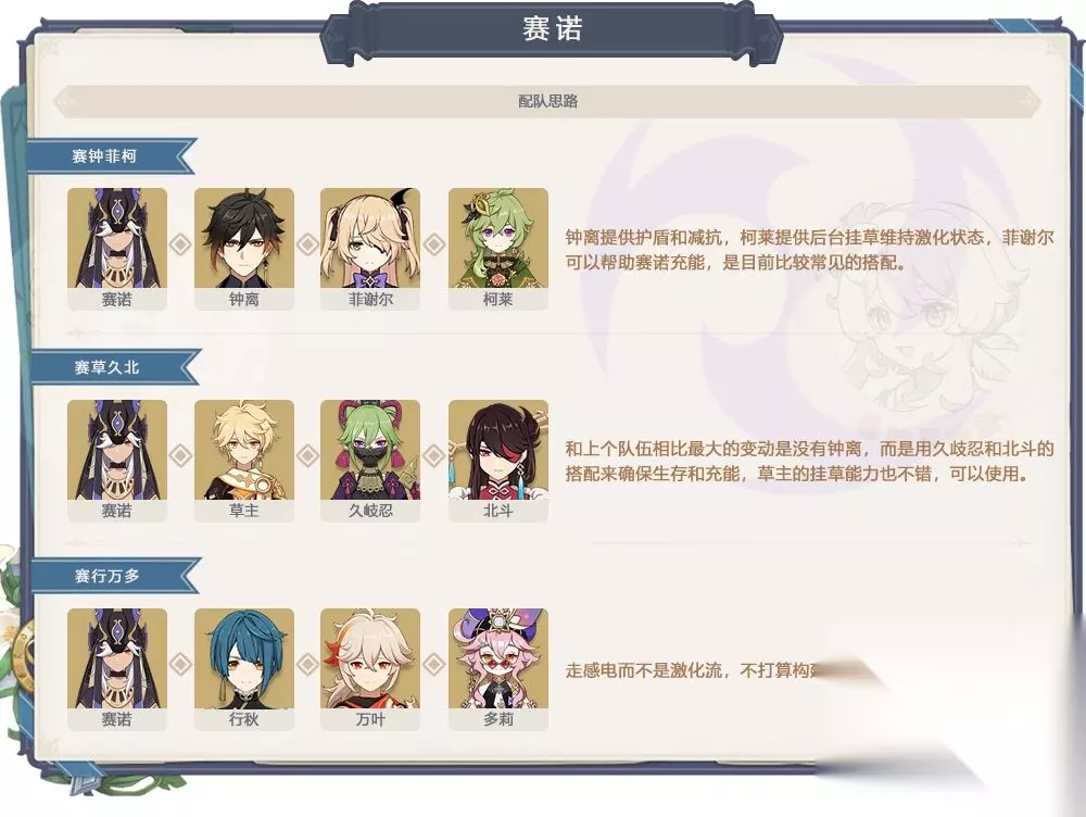 抽取分析: 赛诺是长轴输出角色,主要是依靠激化反应打输出。长时间站场输出以及较高的充能需求让他队友的选择范围比较有限,有待后续角色实装后进一步完善。 如果是缺少输出角色或者打算抽小吉祥草王等后续草系反应相关角色的小伙伴可以抽取赛诺期待一个未来,如果原石不够或者对于强度要求严格的小伙伴可以先按兵不动。
