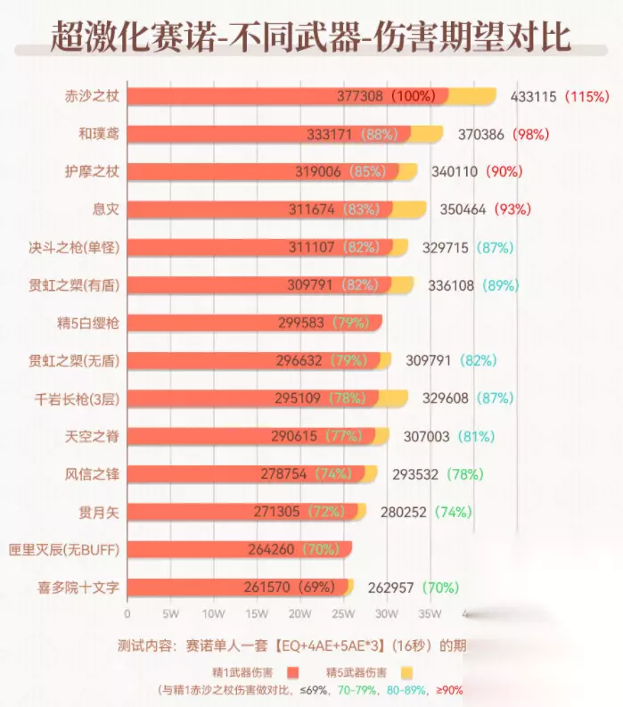 【图片分析】 (1)精1伤害差距: 第一梯队(90%-100%):赤沙之杖 第二梯队(80%-90%):和璞鸢、护摩之杖、息灾、决斗之枪(单怪)、贯虹之槊(有盾) 第三梯队(70%-80%):精5白缨枪、贯虹之槊(无盾)、千岩长枪(3层)、天空之脊、风信之锋、贯月矢、匣里灭辰(无buff) 第四梯队(60%-70%):喜多院十文字 (2)精炼伤害对比: 1.精5决斗之枪(单怪)和精5千岩长枪(3层)伤害相当,伤害与精1和璞鸢仅仅低了1%。 (推荐配队中,赛诺只有在【塞北夜行】里才能让千岩长枪达到3层buff) 2.三星武器精5白缨枪的伤害在精1武器里,排行第7,成为赛诺性价比最高的平民武器。 (白缨枪仅能通过开宝箱获取,记得在背包里留一把精5备用,不要全部当狗粮喂了)