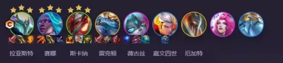 6、圣灵劫 阵容攻略:查看详情 阵容构成: 劫、赛娜、雷克顿、嘉文四世、薇古丝、盖伦、古拉加斯、拉亚斯特、蒙多医生