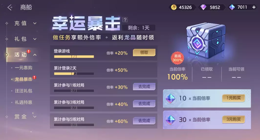 付费1元/3元解锁龙晶暴击,完成任务可获得对应3倍龙晶奖励(30/90龙晶)。两个档位可同时充值,奖励数量叠加,最高可领取120龙晶。