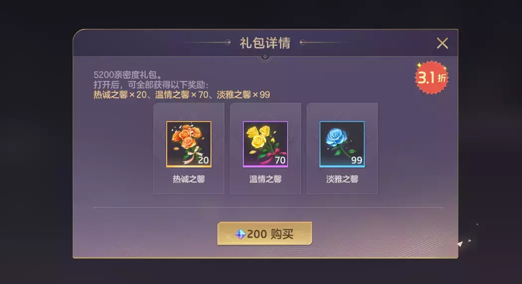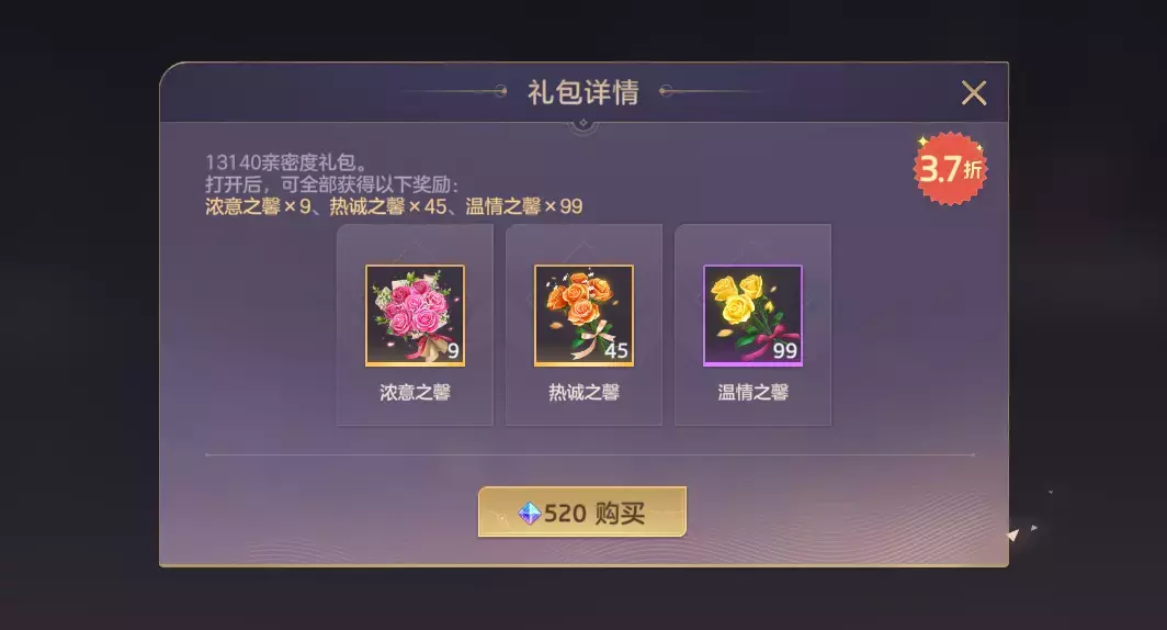 七夕定情礼包、七夕挚爱礼包限时售卖。【七夕定情礼包】内含热诚之馨*20、温情之馨*70、淡雅之馨*99,全部赠予好友可获得亲密度*5200。【七夕挚爱礼包】内含浓意之馨*9、热诚之馨*45、温情之馨*99,全部赠予好友可获得亲密度*13140。