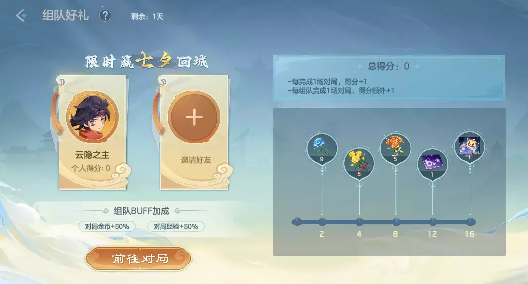 完成对局获得得分,与小队成员共同对局可获得额外得分。根据总得分可获得鹊桥相会回城、羁绊皮肤6折折扣券、淡雅之馨、温情之馨、热诚之馨奖励。