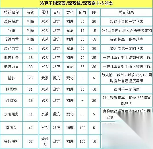 ps:深蓝可以进化成深海霸主,深海霸主不能直接捕捉。 二、深海霸主性格配招推荐 性格推荐:固执 配招推荐:慢镜头+传说力量+过肩摔+水泡阻力 解析: 性格方面,首选固执,固执加攻击,深海霸主是物攻宠物。 配招方面,慢镜头攻击力不错,深海霸主没有任何强化技能,传说力量和过肩摔不错。 技能表: