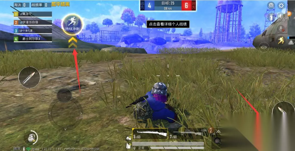 7、进入游戏后,左手按住轮盘【连续冲刺】,右手点击【蹲下】按钮即可飞铲。
