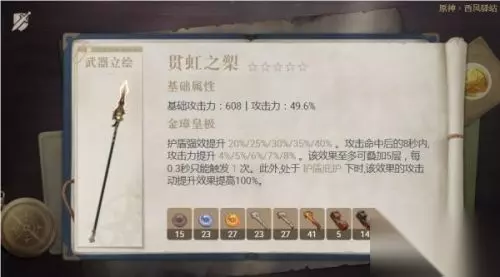 强度指数:★★★★★ 抽取价值:★★★☆☆ 装备评价:贯虹之槊第一次up是跟着钟离第一次的同期武器池,我本以为钟离在V1.5复刻时该武器会在同期武器池,结果策划狠狠给了我一嘴巴子——“钟离跟着盾武系列up也没错啊,不是贯虹之槊又何妨”。 确实,毕竟钟离作为辅助的认知大于其他定位,而盾武系列本质是提高佩戴角色的输出,这么一想反而同期up反倒是有些违和了。不过不妨碍该武器是钟离的“外观毕业”武器。 很多人会怀疑贯虹之槊的强度,它不像其他五星长枪那样有着暴击率/暴击伤害的副词缀,唯一的攻击向词缀就是“百分比攻击力”,虽然偏科,但它偏的真的很多; 在副词缀较少时和其他输出向五星武器差距会略大,但随着双暴词缀的增多,差距也会缩小,上限还是挺高的,只是其他长枪的光芒盖过了它。 精炼提升中高。 抽取建议:虽然夸了它,不过我个人也不推荐刻意抽取它,它可以作为阿莫斯之弓的副产物,但不能作为卡池的主产物。 适合角色:所有输出向的长柄角色(队伍中带盾,特别是钟离)