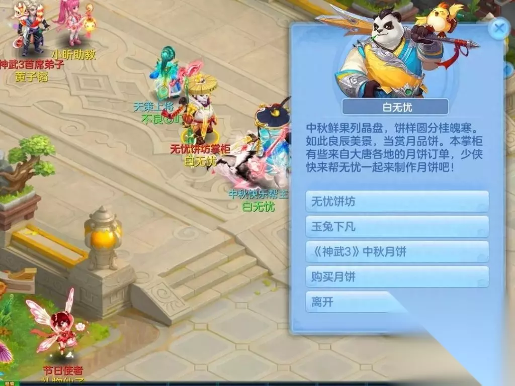 本次中秋节,《神武3》手游同样有丰富的内容,可以让玩家感受到中秋的节日氛围。首先在游戏内的有中秋活动"无忧饼坊"、"玉兔下凡"、"中秋赏月"等。"无忧饼坊"的活动参与地点位于长安城的金銮殿前,大家通过各种渠道来获得相应的月饼生产材料,不同的材料和订单交给白无忧之后可以获取不同的奖励。此外,延续游戏内往年的中秋传统,大家还可以在白无忧处购买可以增加人物属性的"七星伴月"和"伴月七星"两种月饼,带给大家一些小小的提升。