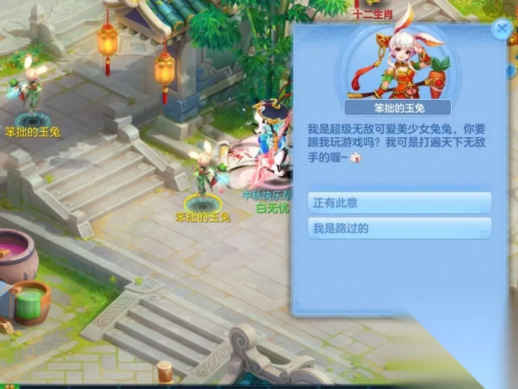 "玉兔下凡"需要大家组队完成,在活动期间9点-23点时间段,每个整点05分野外会刷新出玉兔,击败玉兔之后大家就可以获得完成"无忧饼坊"的材料和订单,战斗难度并不高。此外,平日里的帮派宴会也因为中秋节的关系修改为"中秋赏月",期间还会刷新出"精美月饼",为大家提供更多奖励。