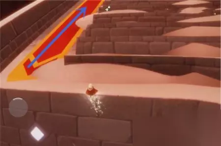 飞上二级台阶后,往下图所示的方向走。