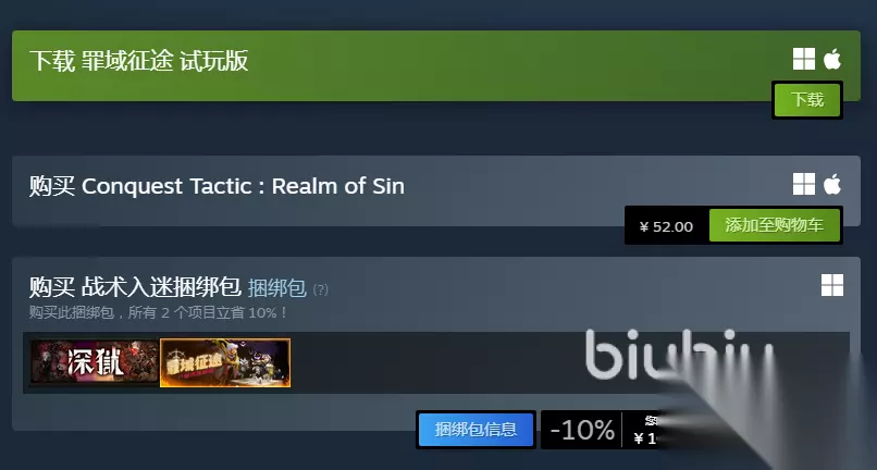 【biubiu加速器】最新版下载 点击下载 罪域征途这款游戏在steam页面中的售价是52元,当前并没有开折扣活动。不过大家可以选择购买捆绑包,捆绑包中有两项内容,分别是罪域征途和深狱,这个捆绑包的价格是105.30元,算起来比单独购买这两个项目要有10%的优惠。如果大家对这一类型游戏感兴趣,比较建议直接购买捆绑包。当然,如果大家对游戏的玩法还不了解,那么可以先下载steam中的试玩版,感受一下再做出决定。