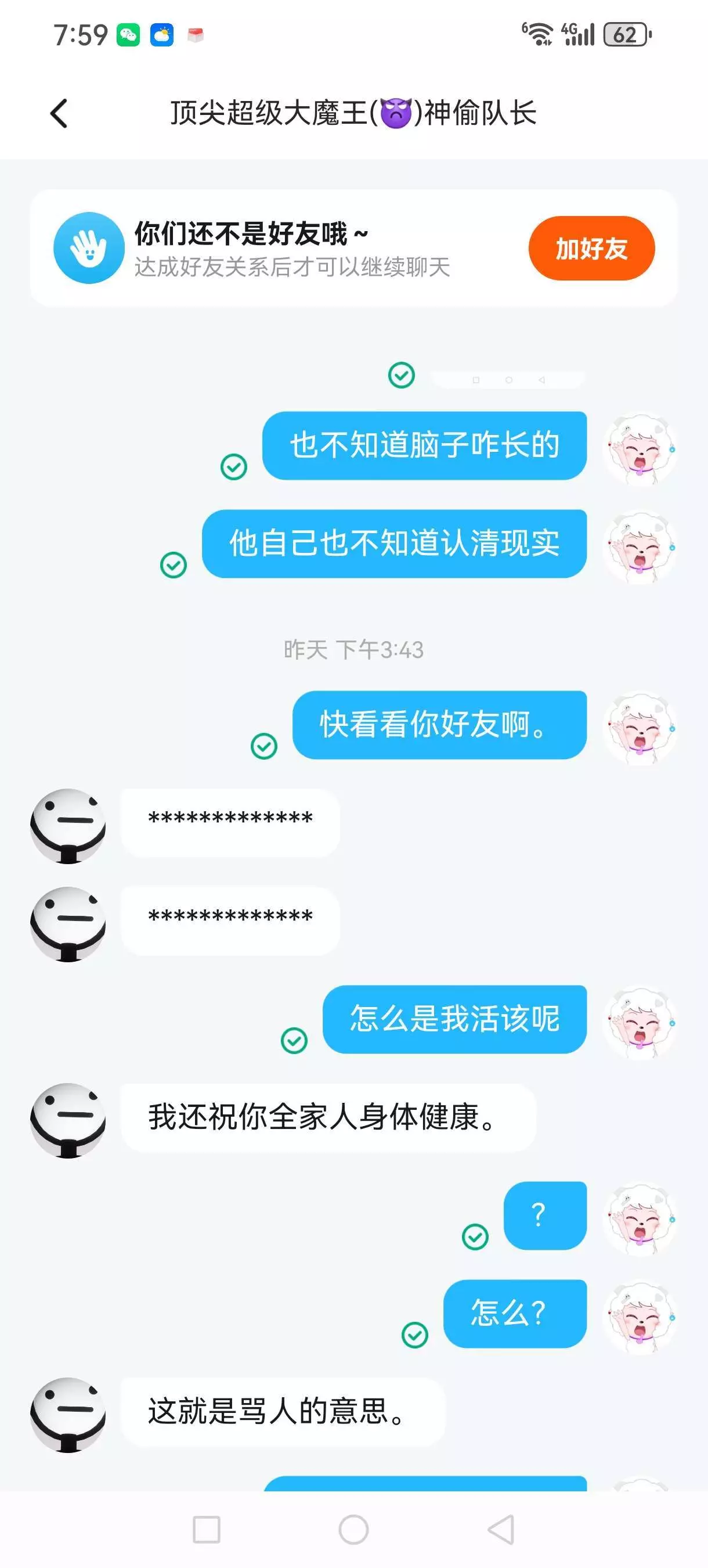 我的妈呀,我这个好友开了个房间,然后还邀请他的一个好友和我。然后后面这个人就退了结果他那个好友就是和我打起来了,还骂我。找了这个人之后海马也不知道是不是护卫犬小号之类的反正就是挂一个人建议举报