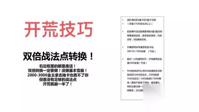 预留金猪3000以上金猪越多越好用来双倍转化战法点,抽卡改变不了啥还抽不到核心赛季越高越难抽到,不要觉得自己可以一发入魂,每个赛季前期发育是非常重要的,一律以发育的需求核心战法点为主。(抽卡就让那些氪金几千几万的人去抽卡吧) 3、开荒碰瓷队选择: 碰瓷队多种多样自己有啥就用啥 1·贾诩(全智 )战法 伪书相间 吕蒙(全武) 战法 白马从义 2·孙尚香(全武)战法 裸衣血战 凌统(全武)战法 矢锋阵 (碰瓷队用法:带几个兵,把战法点给碰瓷队点满级,去碰瓷,目标地最好2分钟内的,碰瓷结束后把战法点卸下来给主力,主力去打,距离近有多个碰瓷队可以多打几次,主力在上,减轻主力队战损减少翻车概率。让越级(极限开荒)成为可能)