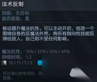 二技能介绍 三技能法术反制,不仅加魔抗,而且还有主动技能,满级的法术反制的cd是3秒,而持续时间是1.2秒,也就是基本每2秒就按一次,这个技能不仅可以为敌法师挡住一个技能,而且可以将技能反弹给对方。(像不像小时候玩的一个游戏,你是小猪,反弹!)