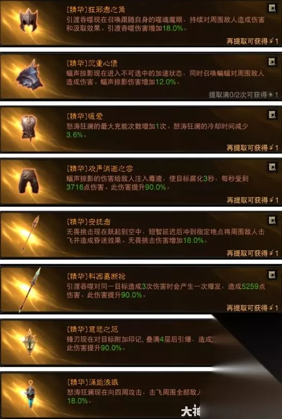 引渡吞噬、蝠声剪影、无畏挑击、锋刃这4个技术是必洗的,剩下一个技术看个人喜爱。狂骑士好 九、魔法特点 暴击率进步 暴击损伤加成率 普攻损伤进步 技术损伤进步 增益状况继续时刻添加 急速添加 配备根底损伤添加 对生命低于30%的敌人损伤进步 对精英敌人形成的损伤进步 遭到一切损伤下降 3米内敌人对你损伤下降 十、觉悟部位引荐 按干流BD使用率来引荐,衣服阴影傍身、护肩蝙蝠代言人、裤子欢声消逝之容觉悟添加蝠声剪影损伤,主手科西嘉断枪、虔敬猎手、头部狂邪者之角觉悟添加引渡吞噬损伤都是十分合适的。副手悬垂圣杯觉悟也能够添加锋刃的损伤,全体来说狂骑士大部分部位觉悟都能够完美适配。