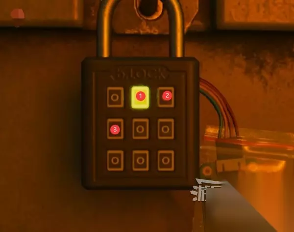 查看锁时注意记下黄色按钮出现的顺序,按照正确顺序按下图的这三个按钮,就能把锁打开。