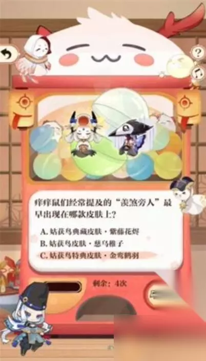 8、痒痒鼠们经常提及的“羡煞旁人”最早出现在哪款皮肤上? 答:C、姑获鸟转典皮肤,金露鹤羽