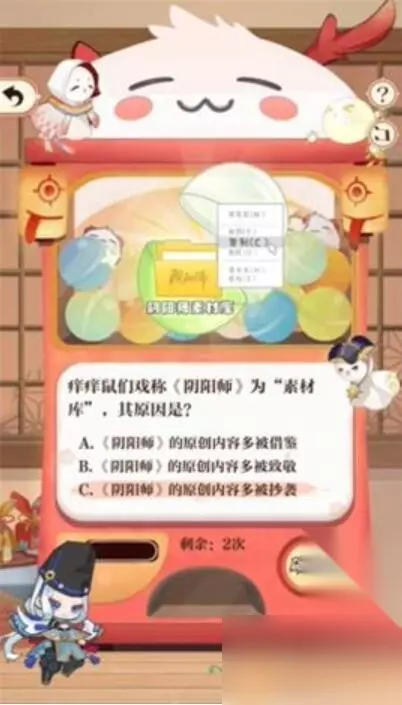 9、痒痒鼠们戏称《阴阳师》为“素材库”,其原因是? 答:C、《阴阳师》的原创内容多被抄委