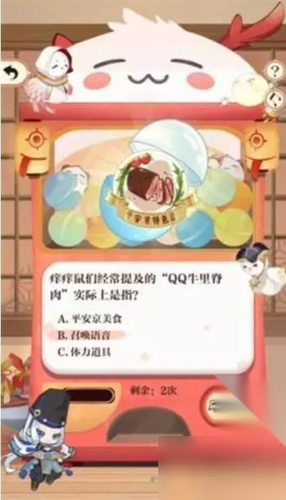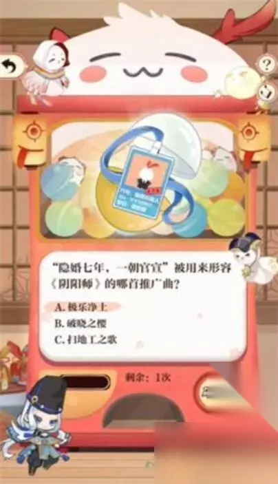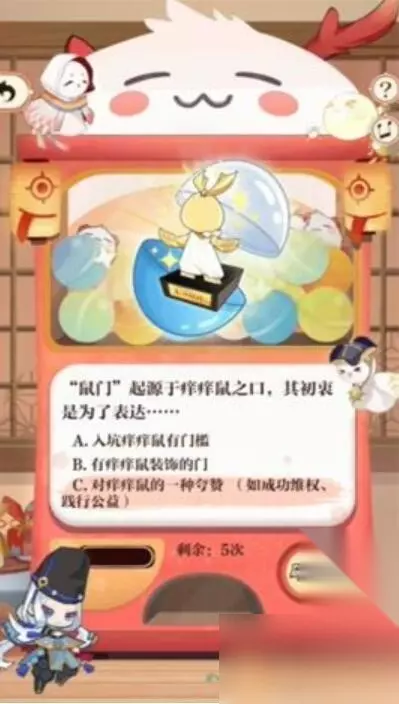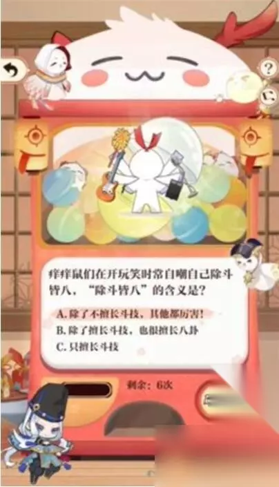 阴阳师游戏这一次会为玩家们带来全新七周年的挑战活动,在回忆扭蛋机的问答活动中,答对问题就可以获取对应的奖励,小编今天整理了关于阴阳师七周年回忆扭蛋机答题答案,需要答案的小伙伴快来了解一下吧。 阴阳师七周年回忆扭蛋机答题答案 1、痒痒鼠们在开玩笑时常自嘲自己除斗皆八,“除斗皆八”的含义是? 答:A、除了不擅长斗技,其他都厉害!