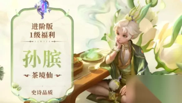 茶境仙 S38赛季战令限定皮肤,孙膑化身不染尘俗小茶仙,茉莉花苞般的发髻腼腆又纯真,腕间佩戴芬芳盈袖的茉莉手串,背后是茉莉花朵错落排布而成的轻盈翅膀。