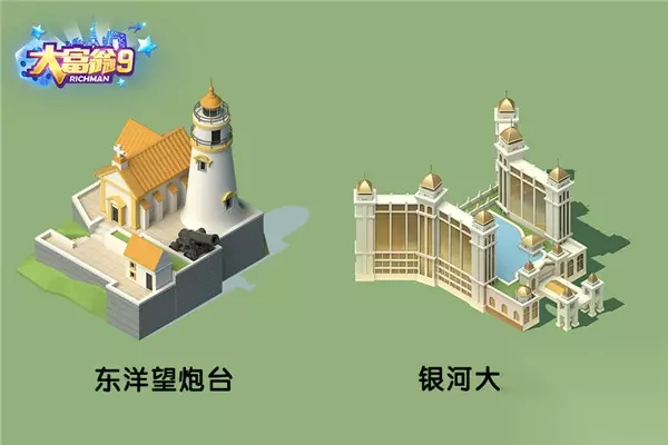 《大富翁9》澳门区域地图 每一幅地图中,建筑是最核心的元素,无论是背景画面的民居、写字楼、教堂,还是由玩家购置建设的房屋,都需要在前期 设计出这些精巧的“小布景”,针对相应城市的地标建筑,还要进行更细致地还原,如下图即为澳门地图中“东洋望炮台” 和“银河大酒店”的3D模型图。