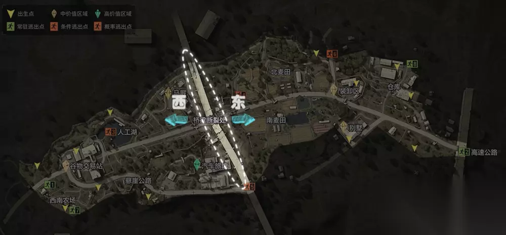 条件撤离点:在地图的两个重要资源区域各有一个条件撤离点,如下图所示。