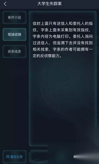 现场侦测 信封上面只有送信人和委托人的指纹,字条上面未采集到有效指纹,字条内容为电脑打印。委托人询问过送信人,但追溯下去并没有找到相关线索,字条的作者可能拥有一定的反侦察能力。