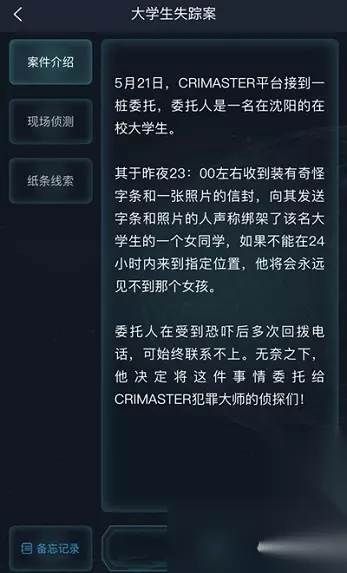大学生失踪案案件介绍 5月21日, CRI MASTER平台接到一桩委托,委托人是一名在沈阳的在校大学生。 其于昨夜23:00左右收到装有奇怪字条和一张照片的信封,向其发送字条和照片的人声称绑架了该名大学生的一个女同学,如果不能在24小时内来到指定位置,他将会永远见不到那个女孩。 委托人在受到恐吓后多次回拨电话,可始终联系不上。无奈之下,他决定将这件事情委托给CRIMASTER犯罪大师的侦探们!