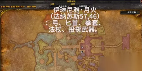 3、达纳苏斯伊琳尼雅·月火:坐标在【57,46】,在此处位置可学弓、拳套、投掷武器等。