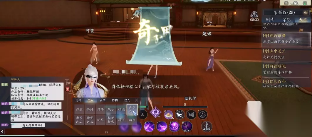 5“盼君归期日”,(15301,18461)这里,站在杨柳青这个NPC面前。6“以和为贵”,前往点位(15272,18179),对该场景当中NPC对话的行为进行劝阻。7“天外来仙”,(16732,19131),路过神秘仙客这里。8“我从山中来”,点位(16363,17786),对这里得到瓶子中的花浇水,花开即可。9“河边茶铺”,具体位置(15543,178052),在这里喝茶。10“树下藏宝”,(15576,17332),树下面有几只猞猁,需要对其抚摸。11“小声密谋”,在猞猁们密谋时,使用动作蹲下。12“不忘初心”,(14945,17052),聊天输入“情撼九天,一剑诛仙!”。13“卿为谁舞”,在山海苑内,从门口的大光球这里进入,进门后右转直走,能看到一群跳舞的NPC,和她们一起跳舞,使用舞步一。